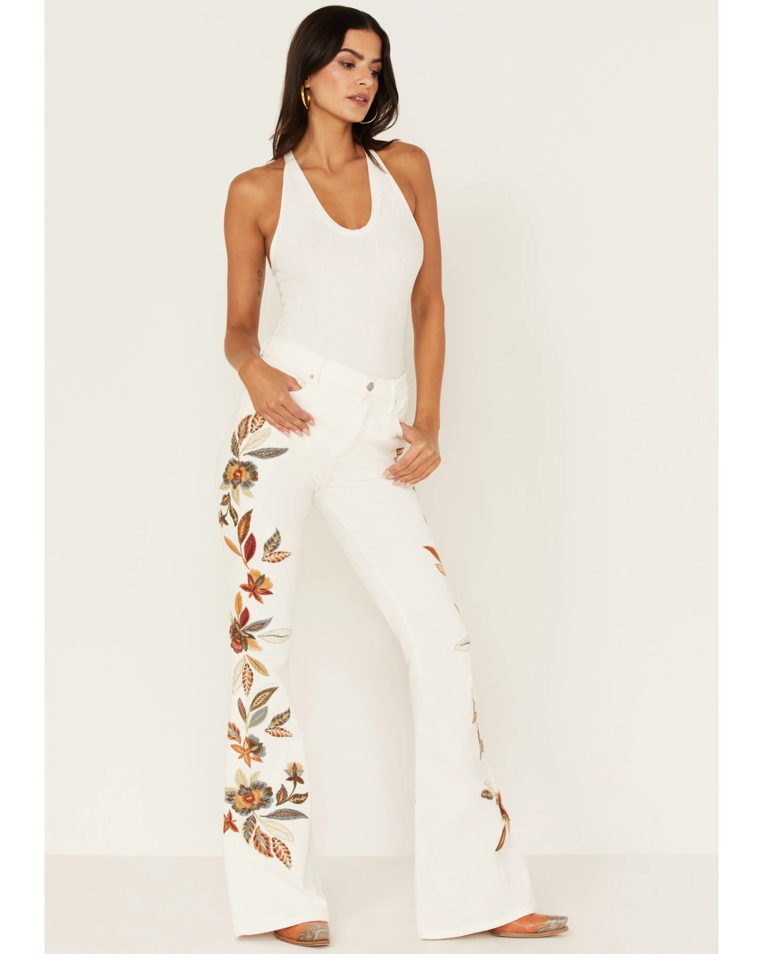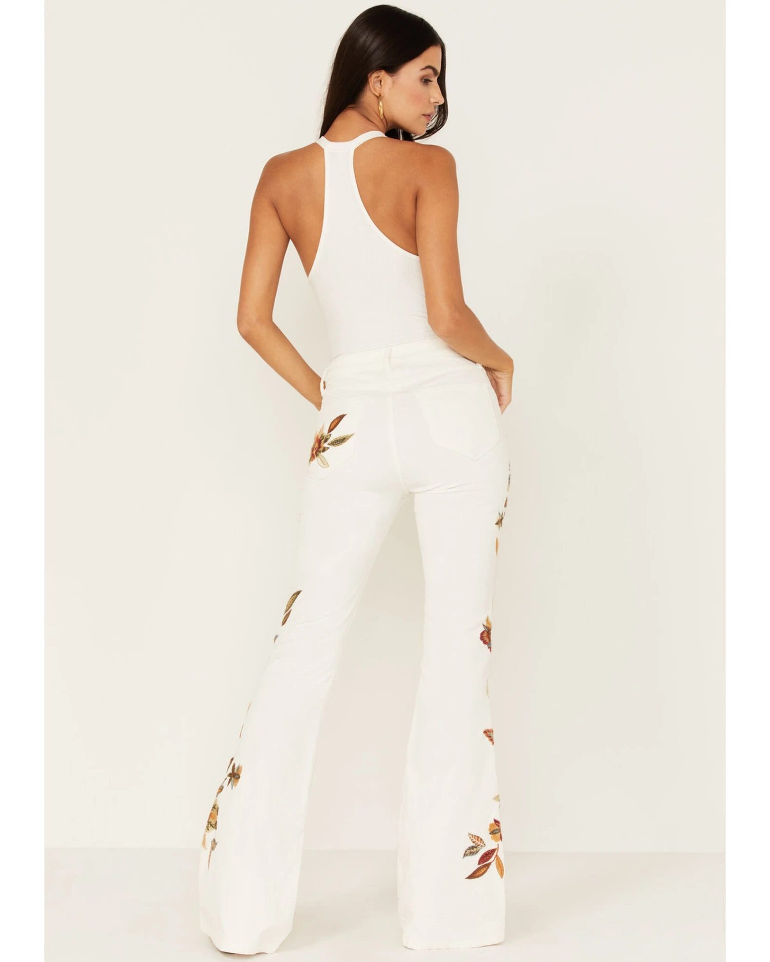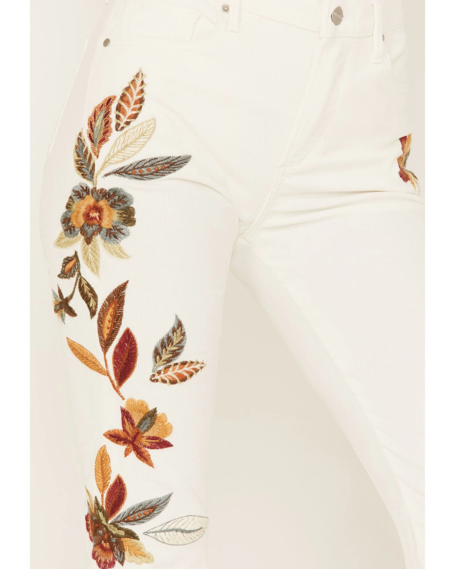 - White with embroidered floral design on left back pocket and down legs