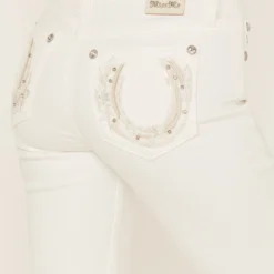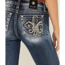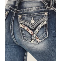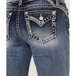 Miss Me Women’s Medium Wash Mid Rise Embroidered Paisley Distressed Bootcut Jeans – Long