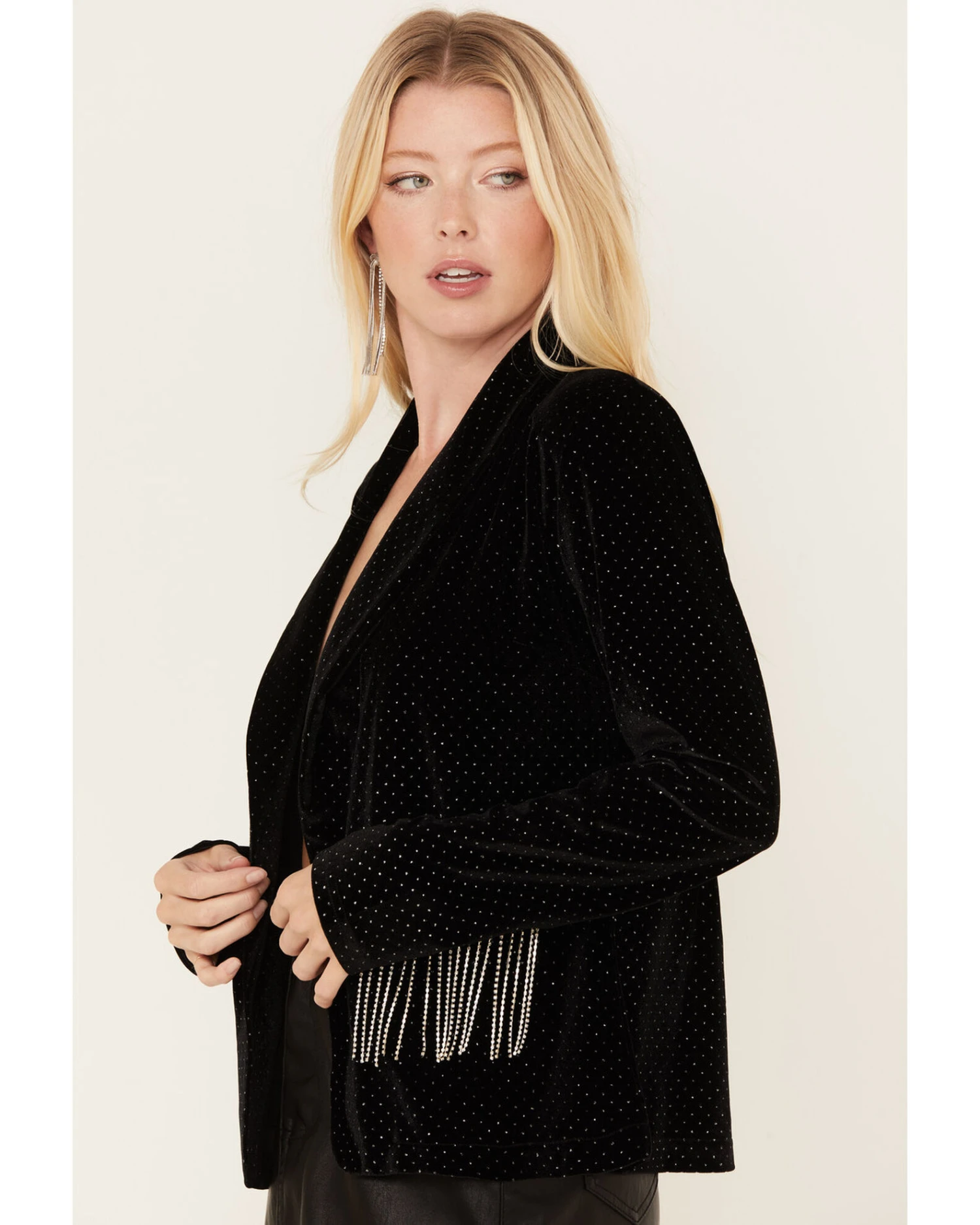 - Two hand pockets with rhinestone fringe detailing