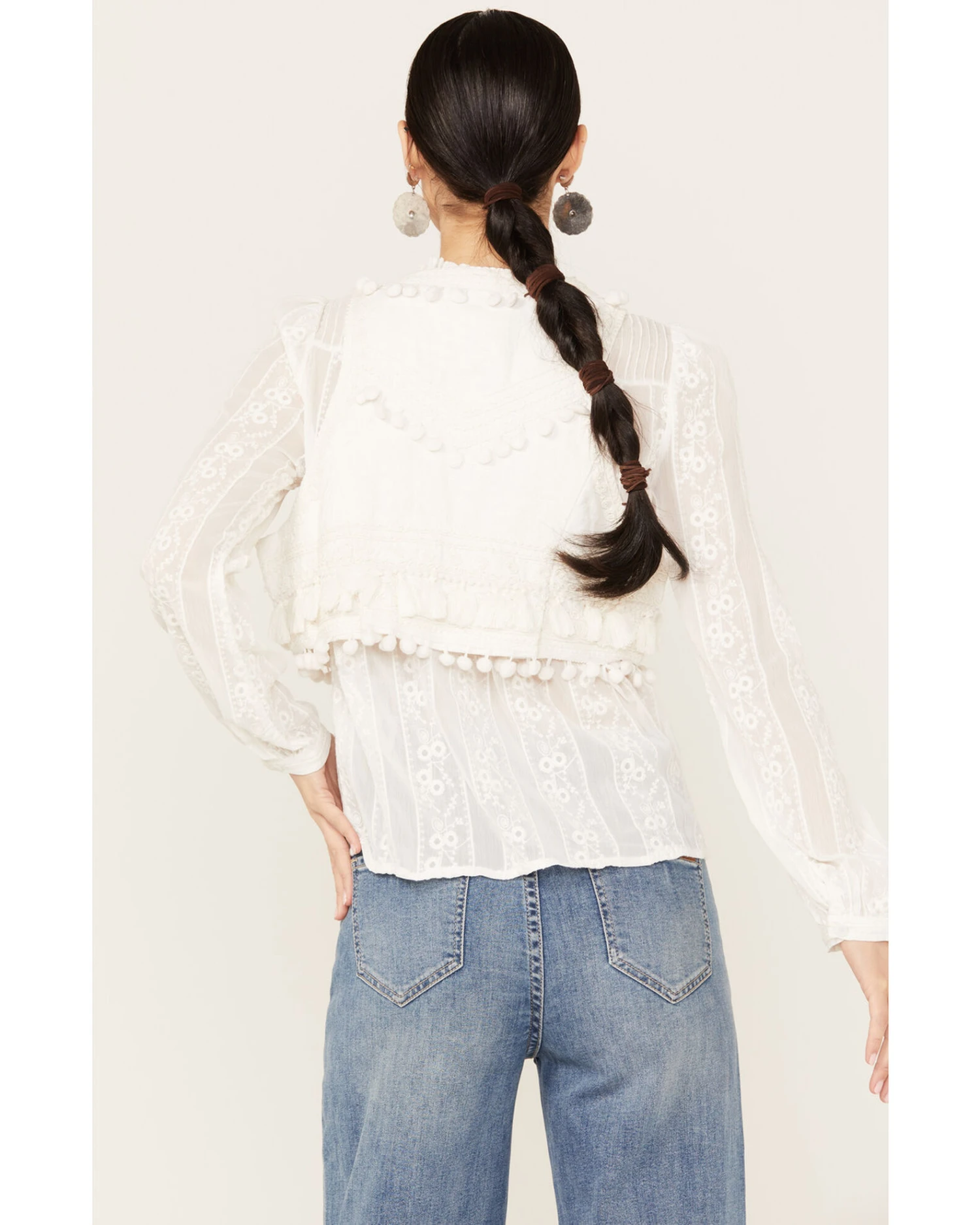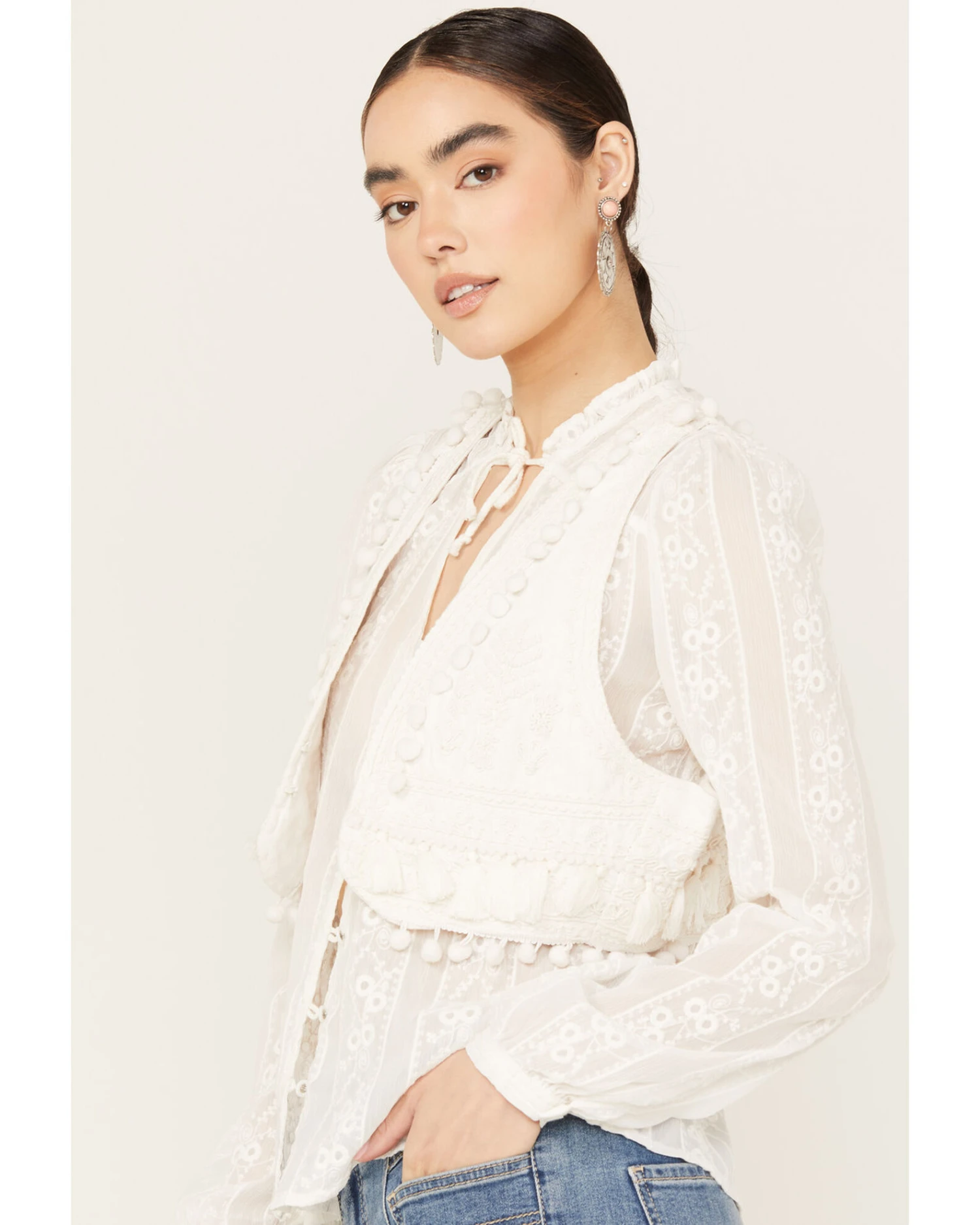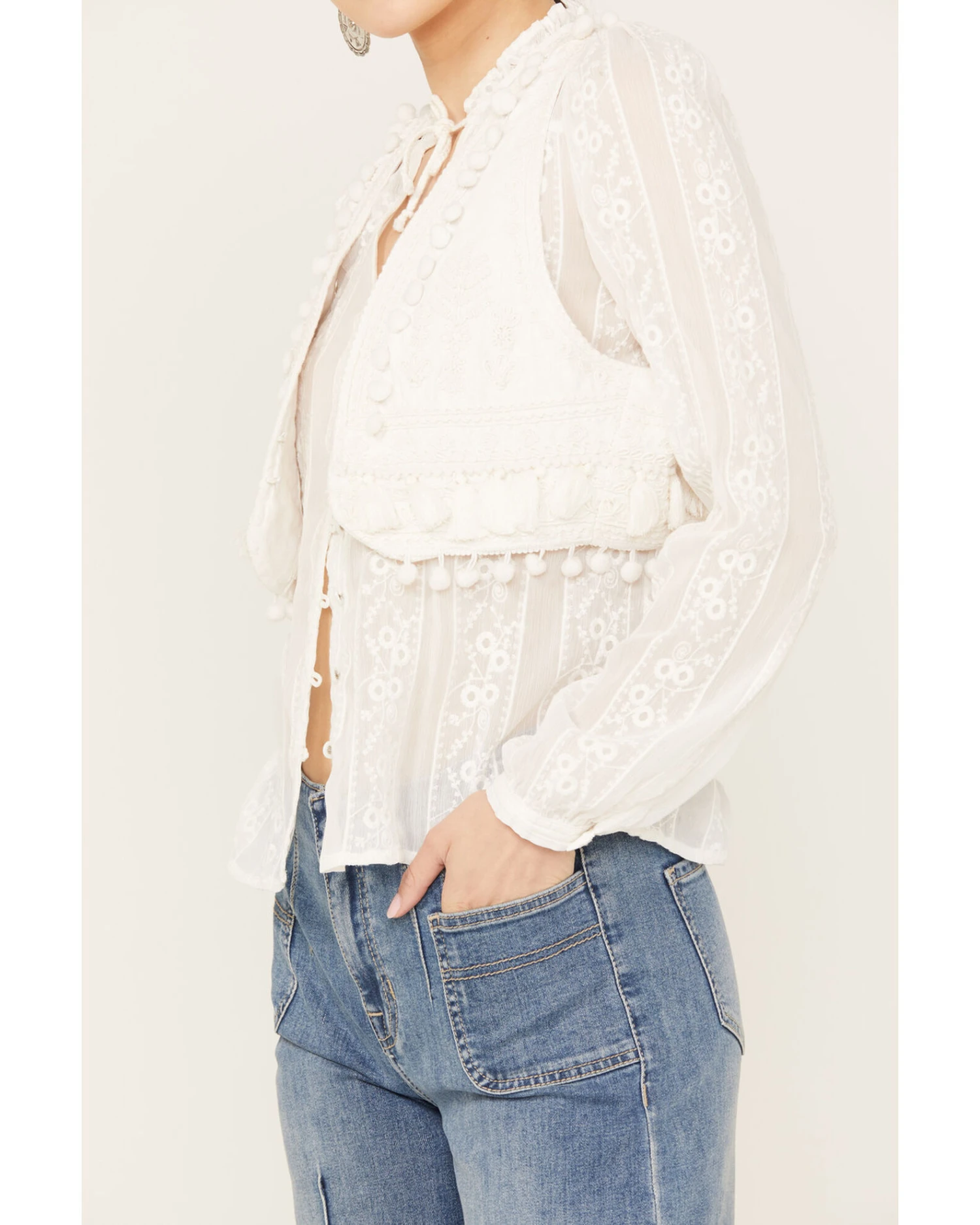 - Floral embroidery and tassel accents throughout